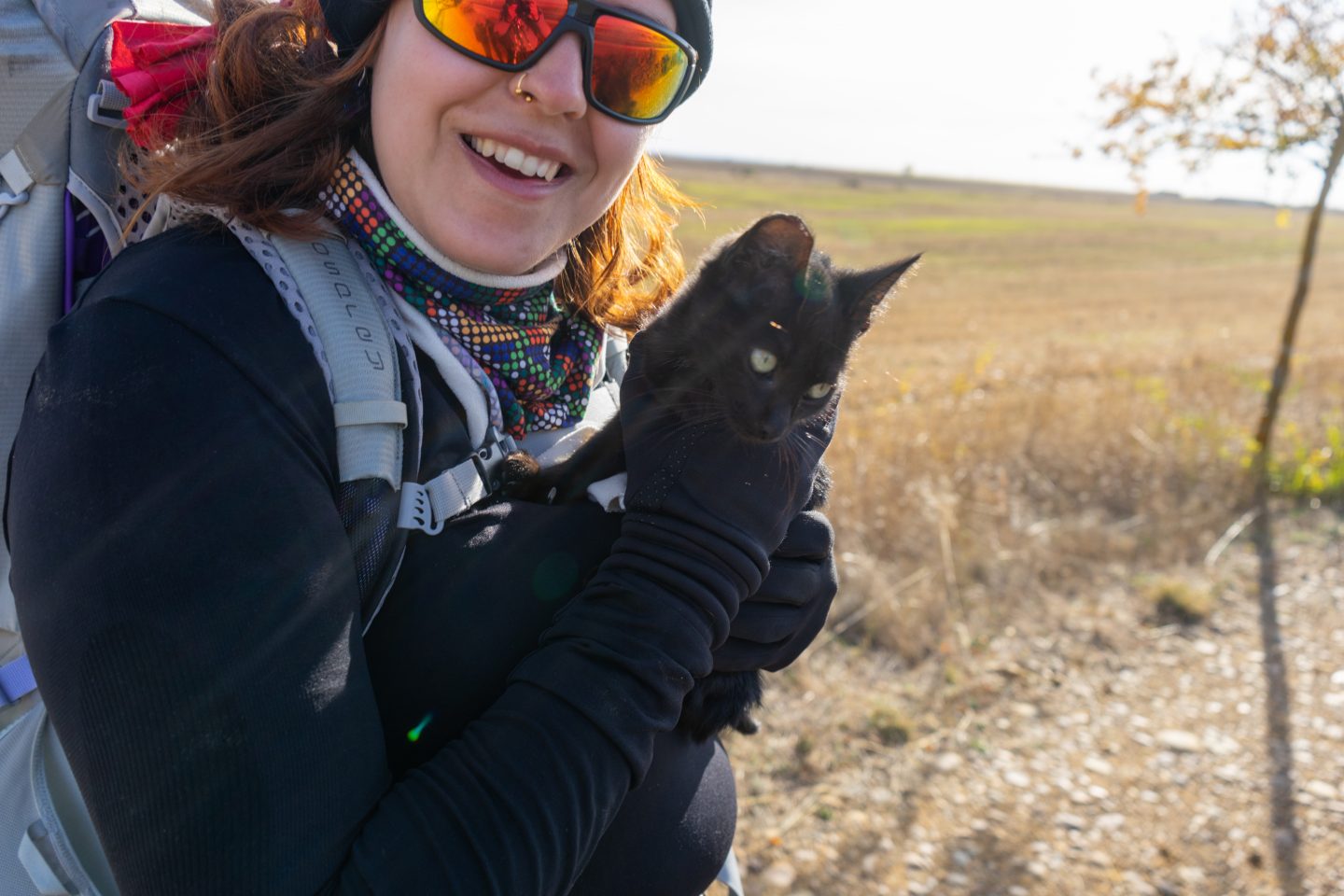Once we met a really hungry kitten on the way to Terradillos de los Templarios. We were quite surprised to hear such a loud meow coming from a skinny black kitten. He (as we assumed) seemed scared and lost, walking on an asphalt road in the middle of nowhere, at least 4 km far from the nearest village. Someone must have left him there! He was used to people and immediately came to greet us. As we continued our walk, he began following us with loud meowing. I fed him a piece of chorizo. He must have been starving! He would not have survived, sooner or later he was going to be run over by a car. This is exactly how all my cats in Slovakia died. I didn’t want this to happen to Santiago! We gave him an appropriate name and decided to bring him to the nearest village.